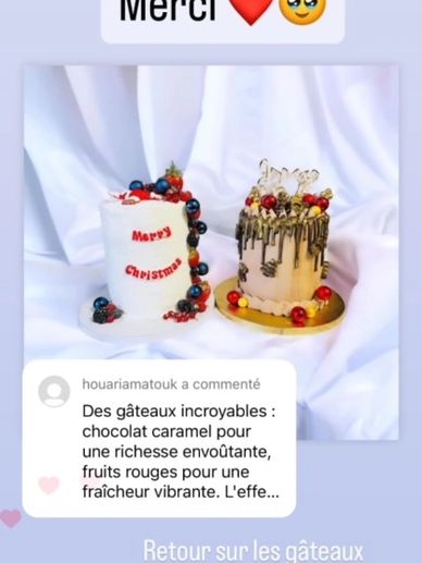 " Des gâteaux incroyables: chocolat caramel pour une richesse envoûtante, fruits rouges pour une fraîcheur vibrante. L'effet "whaou" garanti auprès de vos invités ! un grand Merci ! les gâteau excellents en plus d'être très beaux !"