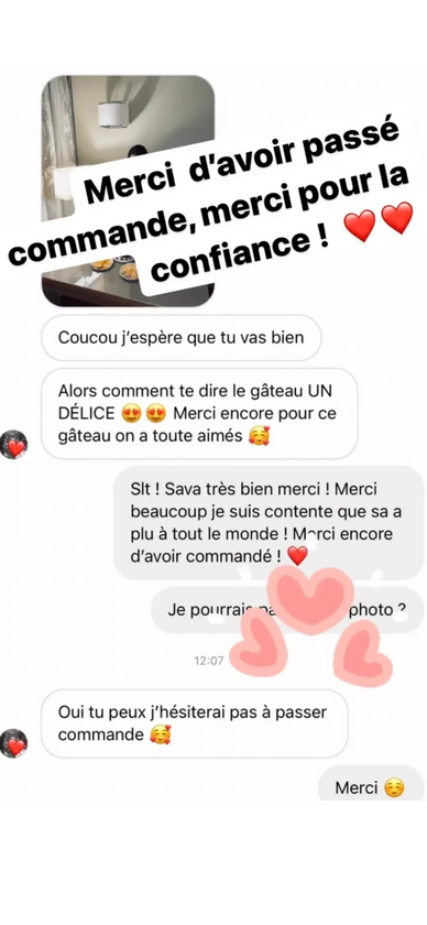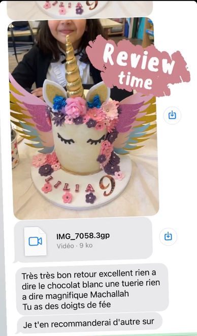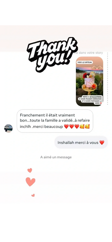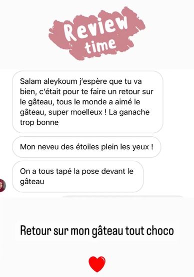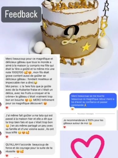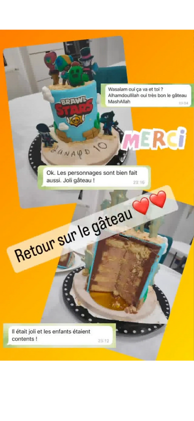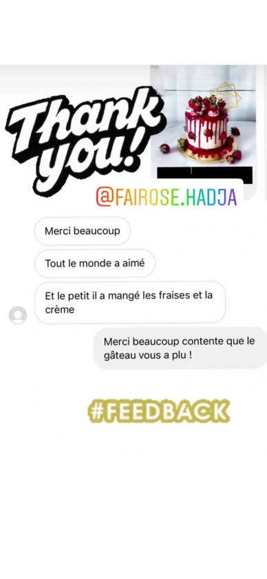 " alors comment te dire le gâteau UN DELICE , merci encore pour ce gâteau on a toute aimés, j'hésiterai pas à passer commande"